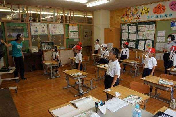【フェイスシールドで新型コロナウィルス感染症対策】 総合企画コーポレーションさんから寄贈していただいたフェイスシールドを活用して学習しています。1年生が,国語で「あいうえお」の発音練習をしました。口形を意識しながら発音するためにはマスクをしていては難しいので,フェイスシールドが活躍します。 この他にも,音楽での歌唱・英語の発音・いろいろな教科での話し合い活動などの場で,使わせていただいています。ありがとうございます。