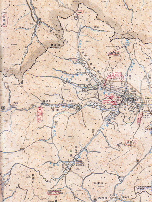 この県道を進むと田原の天狗の里五千年風呂に着きます。田原小学校の校舎や講堂を改造した温泉です。地下五百メートルで、ラドン含有量がきわめて多い水脈を掘り当てました。ホカホカして湯冷めがしないことで知られています。天狗の里の名前は、「天狗しで」からいただいたものです。天狗しでは、この天狗の里から西方の熊城山の山麓にあります。大朝小唄の各番で歌う囃子唄のシデノ木です。