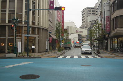 左の歩道に記念碑がある