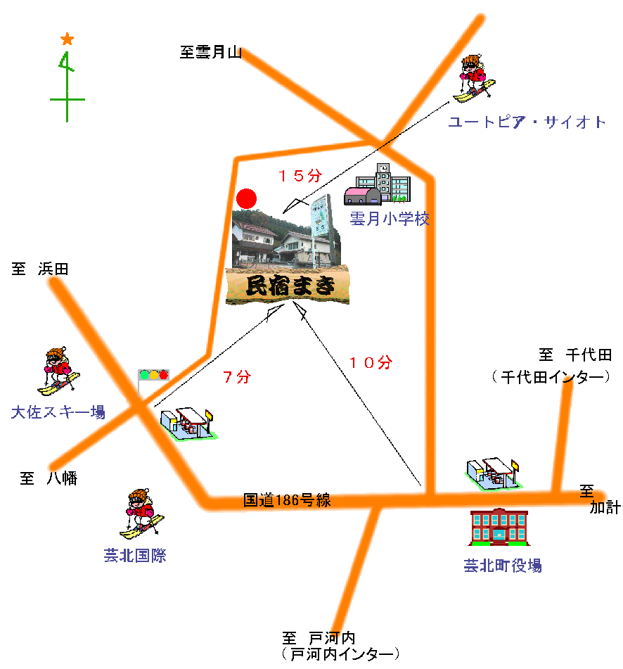 | まきはうすの詳細地図(旧名:民宿まきの地図です) まきはうすの座標です。 N =34° 45′29″ E =132° 16′10″ 〇ユートピア・サイオトから・・・雲月小学校前のT字路に出て右折してすぐに左の道におりて約2〜3分 〇パインリッチリゾート芸北(芸北国際)から・・・・・・・・・八幡別れの交差点を右折して約7分 〇大佐スキー場から・・・・・・・・・・・・・・・・・・・・・・・・・・八幡別れの交差点を左折して約7分 |